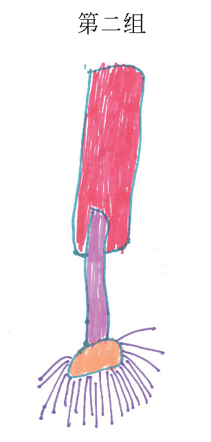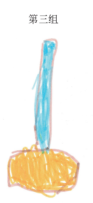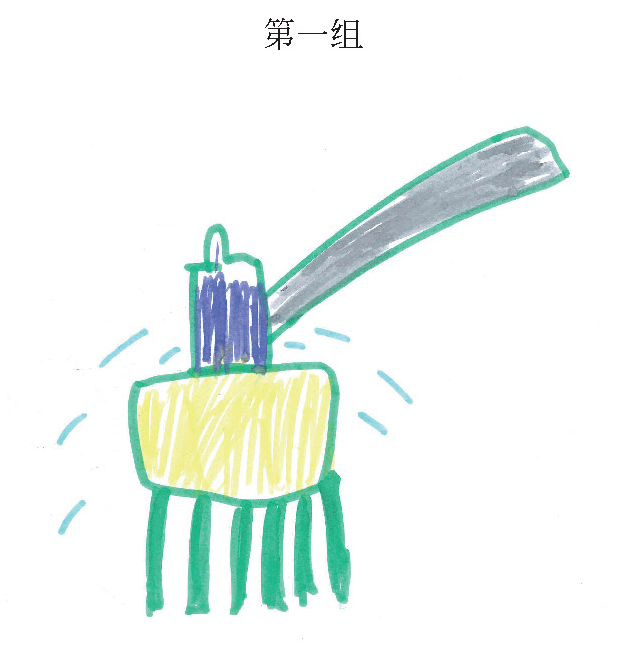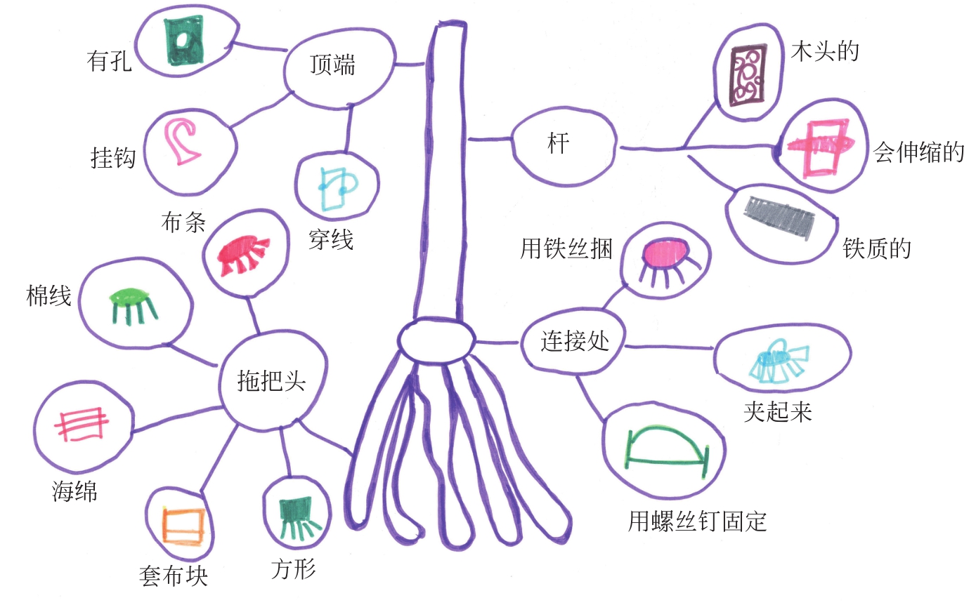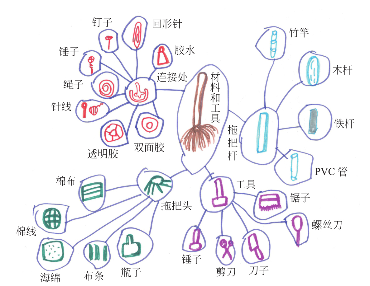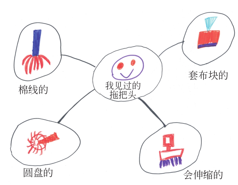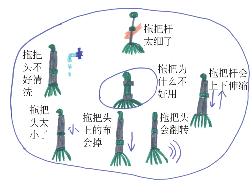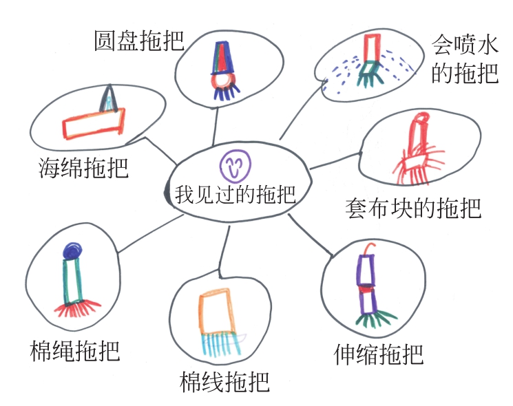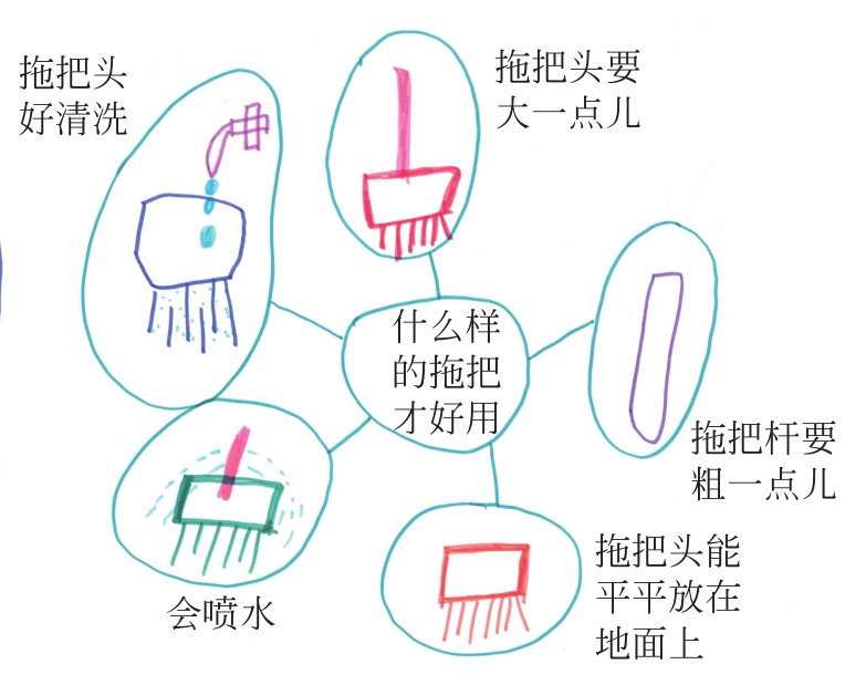 幼儿根据想做的拖把类型分组,各组绘制出了拖把的设计图。