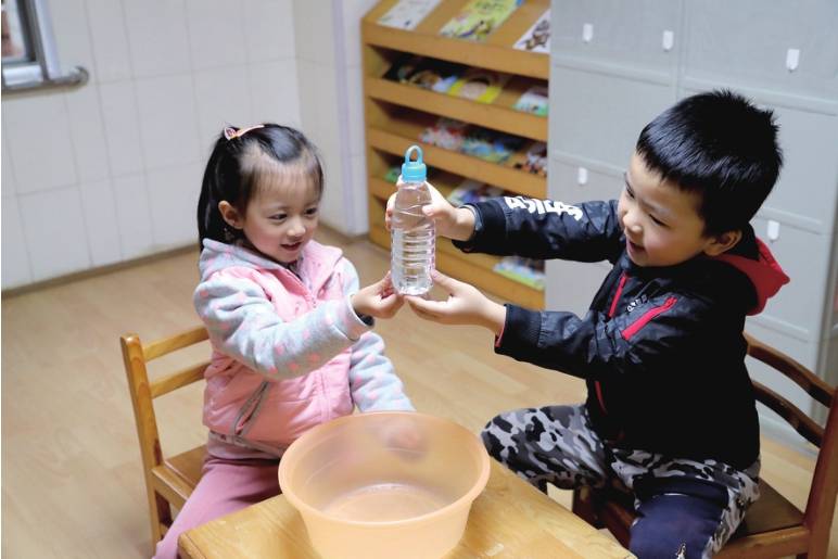 【教师支持: 教师为幼儿提供塑料大盆、矿泉水瓶和刺针,开展“玩水”这一探究活动,与幼儿一起探索水无法从矿泉水瓶身上的洞里流出来的原因。】
