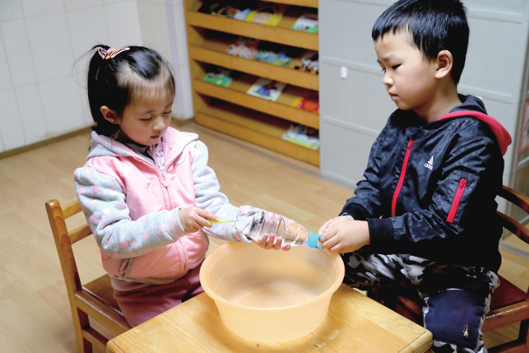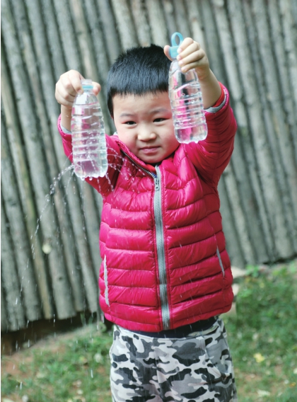 幼儿在矿泉水瓶上扎洞,但是水并没有流出来。