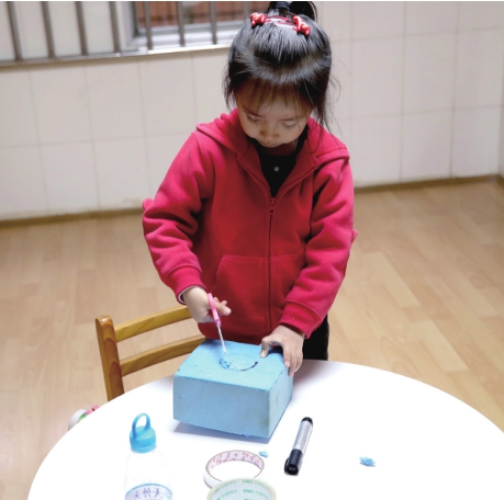 首先,教师引导幼儿将生活经验迁移到问题解决的过程中。幼儿在教师的引导下,将洒水壶上有很多小洞的生活经验进行迁移,在矿泉水瓶上扎一些小洞做成洒水壶,将塑料板能防水的生活经验进行迁移,来做挤水板。