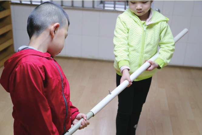 【学习品质: 幼儿通过多次尝试,解决了“把两根杆子固定住”的问题,幼儿在此过程中表现出了敢于探究和尝试的良好学习品质。】
