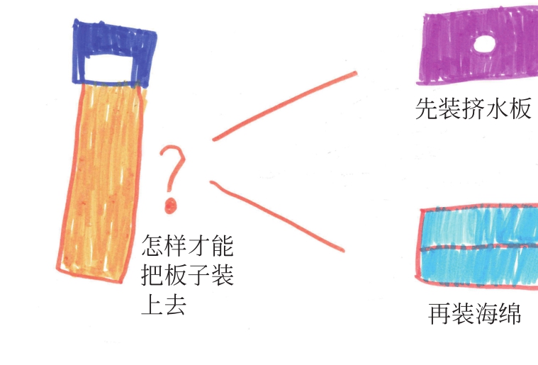 请王师傅帮忙在挤水板上打洞后,幼儿动手安装挤水板,但是杆子被海绵挡住了,挤水板安装不进去。在教师的引导下,幼儿先装挤水板,再装海绵,解决了这个问题。