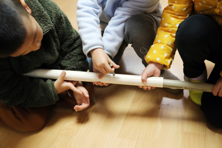 【教师支持: 既要方便两根杆子伸缩,又要方便两根杆子固定,这对于幼儿来说不仅是一个认知的难点,更是一个技术的难点。当幼儿再次遇到这一困难时,他们感到了无助和灰心。此时,教师鼓励的话语增强了幼儿克服困难的勇气,支持着他们通过努力取得最后的成功。】