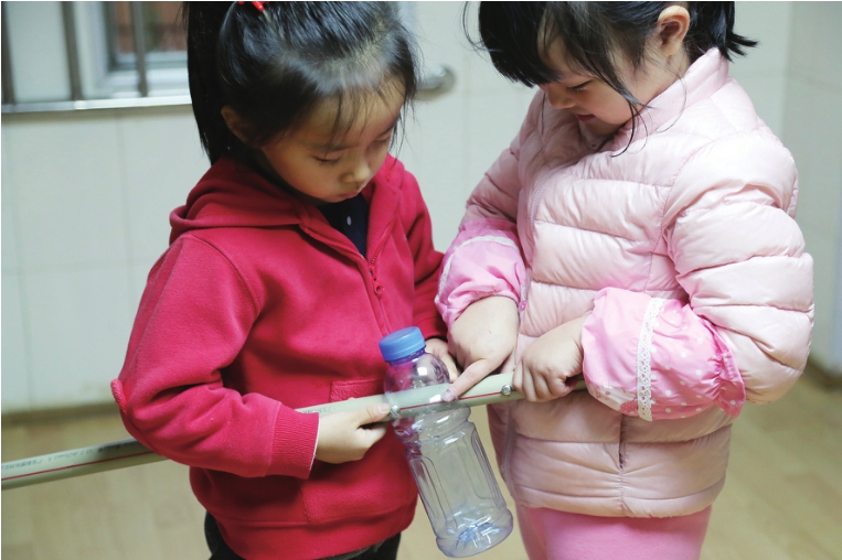 幼儿尝试用橡皮泥把瓶子上的空隙堵住,但瓶子还是会漏水。