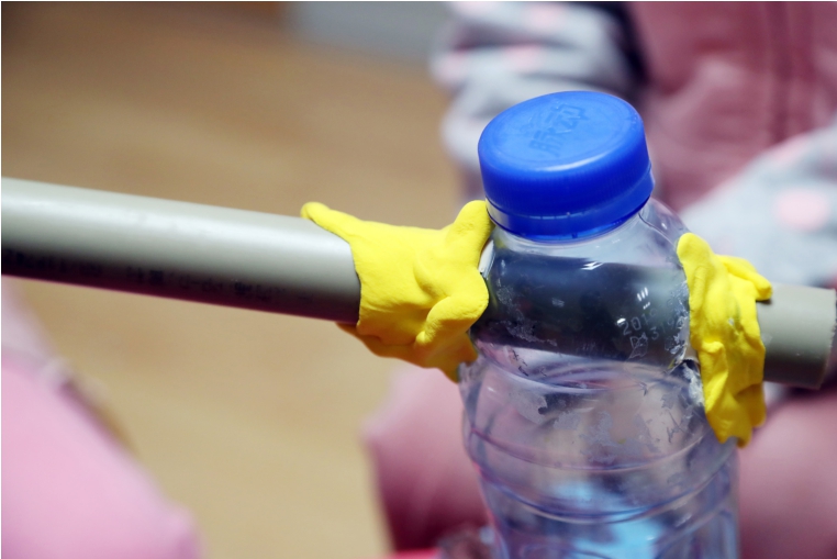 香香:把洒水瓶插进洞里,拖地时一用力,洒水瓶就掉出来了。