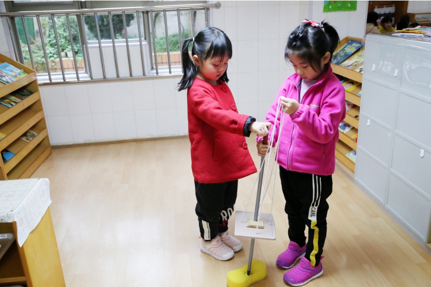 【经验迁移: 幼儿利用棉绳柔软的特性,解决了拉绳剌手的问题。】