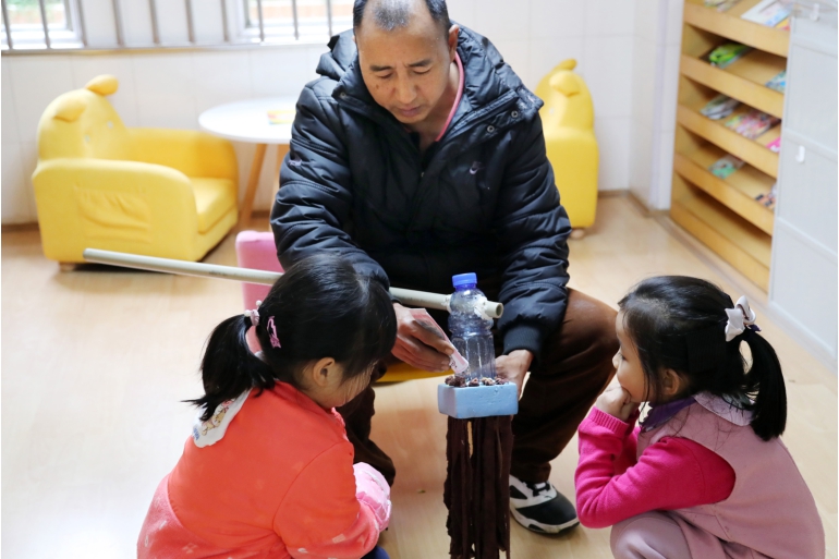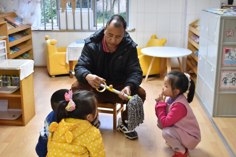幼儿请李师傅帮忙。李师傅理解了幼儿的意图后,帮忙找到了合适的螺栓,并在外面的杆子上做了固定架,固定住螺栓,使拖把杆变得方便伸缩了。