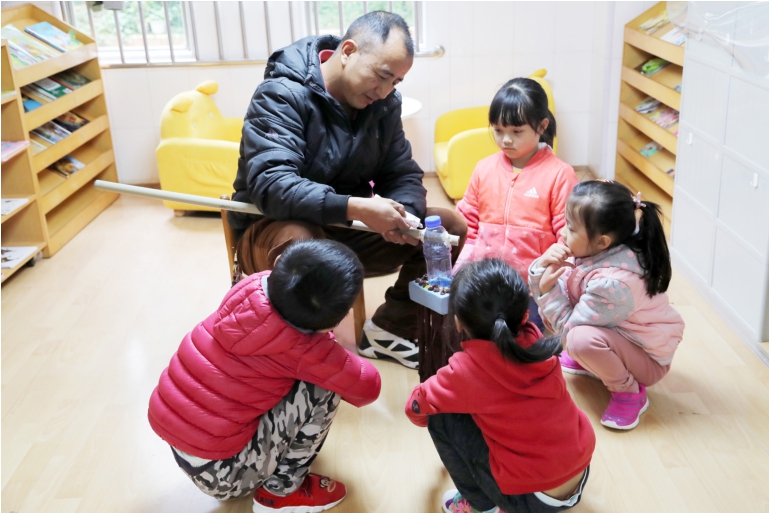幼儿请李师傅帮忙,将免钉胶涂抹在瓶子与海绵连接处,洒水瓶被固定住了。