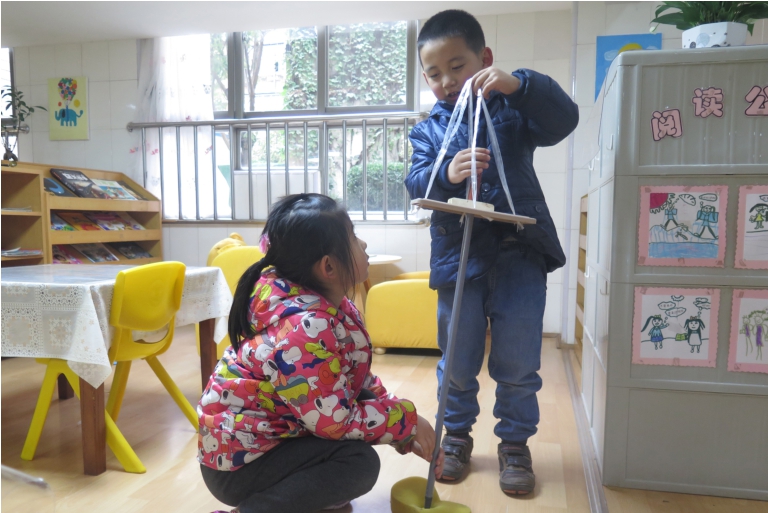 【学习品质: 为了解决“伸缩拖把杆不方便伸缩”的问题,幼儿主动思考不同的解决方法并进行了热烈地讨论。他们尝试了两种不同的方法,最终成功地解决了这一问题,幼儿在此过程中表现出了积极主动的良好学习品质。】