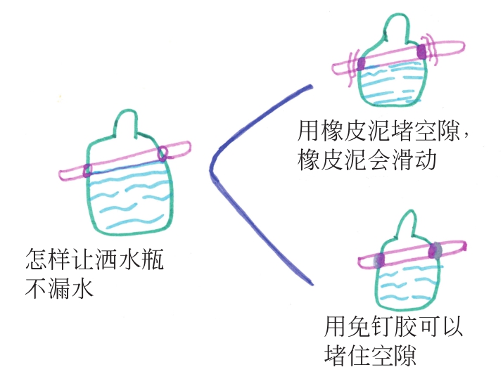 曦曦:橡皮泥堵住空隙后,洒水瓶就不漏水了,但是过一会儿橡皮泥就松了,空气又流进去了。