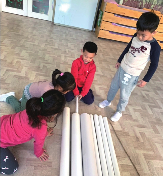 【经验迁移: 幼儿将玩水管玩具的经验迁移到连接管子的活动中。】