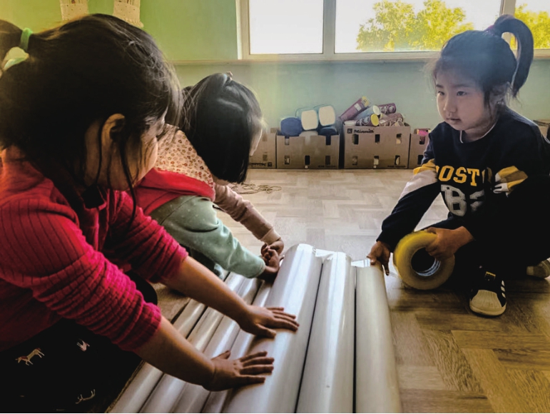 幼儿分为了两组,开始按计划制作滚筒传送带。