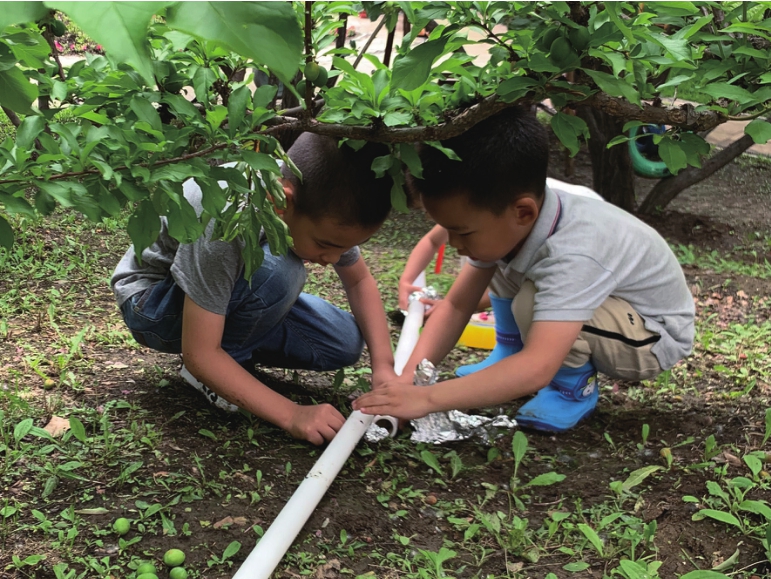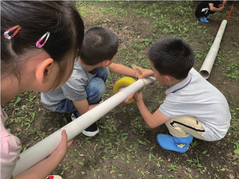 幼儿经过反复实验,发现用交叉成三角形的方法可以把管道固定得更牢固。