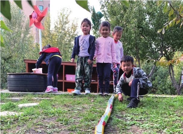 第一组幼儿截取了1/2圆,并建成了果子传送带。但由于薯片桶开口大,在山坡起伏不平的地方,果子会滚落出去。第二组幼儿截取了3/4圆,试验后发现即使在起伏不平的地方,果子也不会滚落出去。