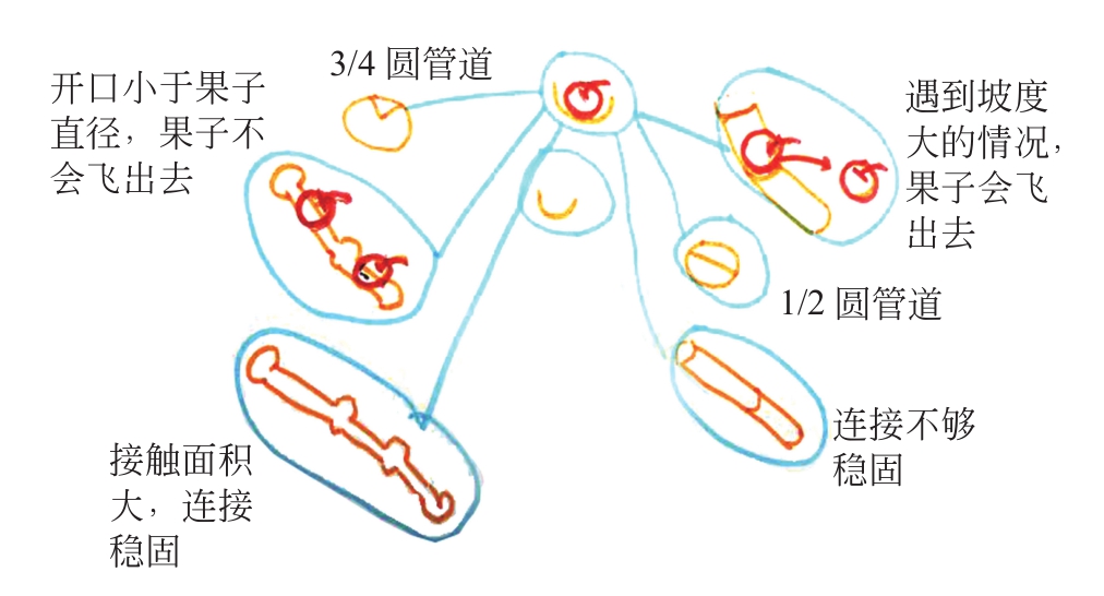 在这一阶段,幼儿用气泡图分析并总结了管道断开的原因,还用气泡图对比了3/4圆管道和1/2圆管道运果子的效果。活动结束后,幼儿还用流程图对果子传送带的制作过程进行了回顾与梳理。