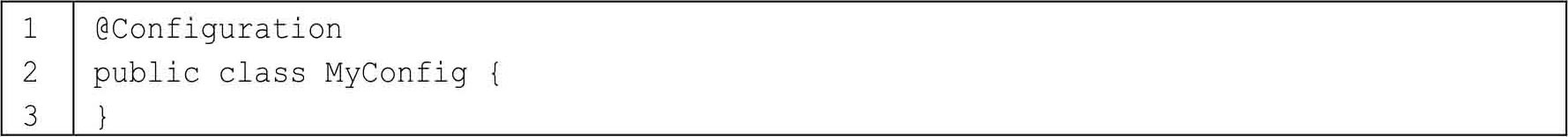 虽然项目的启动类也包含@Configuration注解,但是开发者可以创建一个新的类专门用来配置Bean,这样便于配置的管理。这个类只需要加上@Configuration注解即可,代码如下: