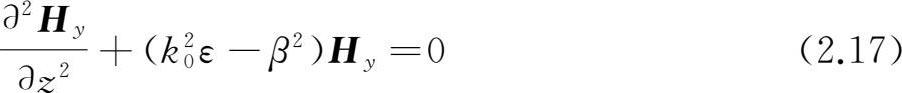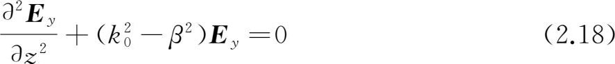 第二,为简单起见,假设一个一维问题为 E ( x , y , z ) = E ( z )e i βx ,其中复参数 β=k 0 x 为波的传播常数,对应于波矢在传播方向上的分量, k 0 = 2π/ λ 0 为真空中的波数, λ 0 为入射波在真空中的波长。将此式代入式(2.15)可以得到所需要的波动方程形式: