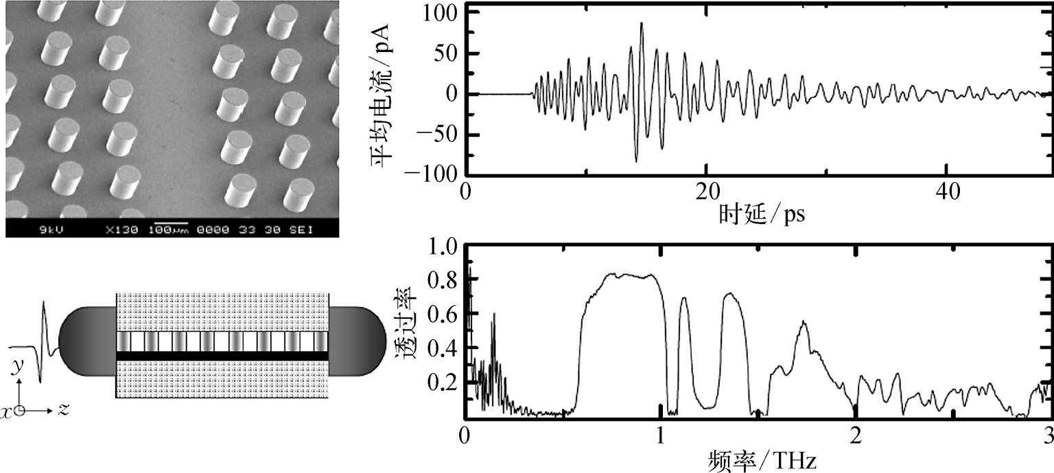 Grischkowsky等在介质柱表面镀大于100nm厚的金属膜,就形成了THz金属光子晶体。由于高欧姆损耗,金属光子晶体在光波波段无法实际应用,但理论和实验证明金属光子晶体在THz波段的传输性能是非常优良的,并表现出完全不同于介质光子晶体的带隙特性,这也是THz光子晶体的一个重要特点。