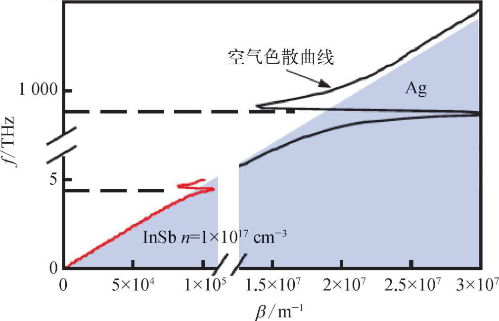 ,即THzSP波无法局域在金属-介质表面传播,其与自由空间中的THz波性质无异,因此简单金属-介质平面无法支持THzSP波。但是比金属载流子浓度低很多的半导体材料能够满足