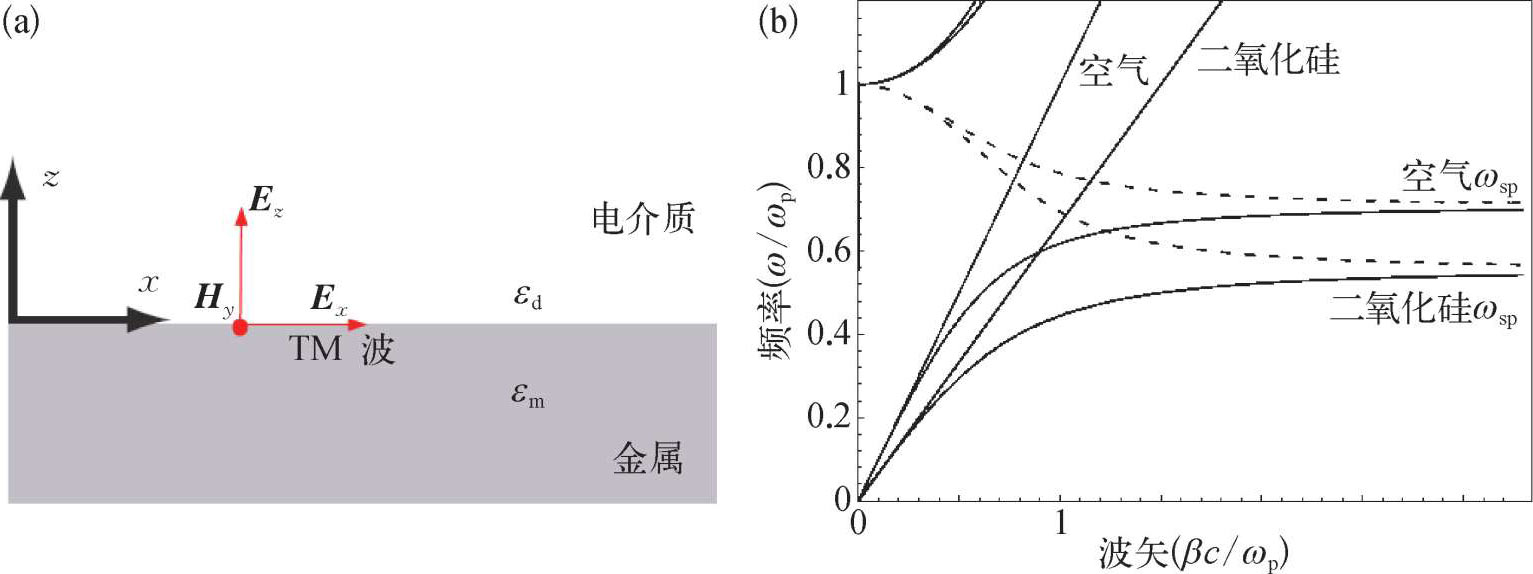 表面等离子体(SurfacePlasma,SP)是由导体和介质分界面上的自由电子集体振荡产生的一种准静态电磁场模式,它强烈地局域在导体-介质表面并沿表面传播。如图2.4(a)所示,金属和介质的介电常数分别为 ε m 和 ε d ,电磁波沿无限宽金属-介质表面的 x 轴方向传播。电磁波有TM和TE两种偏振模式,将那些非零分量代入求解时谐电磁场的Helmholtz方程,并引入金属-介质界面上的连续性边界条件,可以得到TM波存在有意义的解: