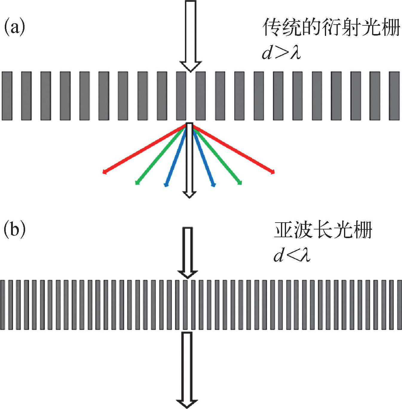 广义上的光栅包含二维的周期性柱阵列或孔阵列结构,是一类具有上百年研究历史的光学器件,其在衍射分光、色散补偿、全息变换等众多领域均有非常重要且历久弥新的应用。图2.9(a)为传统的衍射光栅,其栅格周期 d 大于入射光的波长 λ 。宽带入射光在经过衍射光栅之后会发生衍射,展现出显著的多级色散效应,其衍射场分布可以通过经典的基尔霍夫(Kirchhoff)衍射理论进行分析。亚波长光栅的栅格周期 d 小于或与入射光的波长 λ 相当。光在透过亚波长光栅传输时可能会出现多种光学异常效应,产生强烈的谐振和偏振相关响应,从而无法用经典的Kirchhoff衍射理论进行计算。如图2.9(b)所示,这些光学异常效应还导致亚波长光栅一般不产生像传统的衍射光栅那样的多级色散效应,对其透射场分布的计算应使用严格耦合波法。
