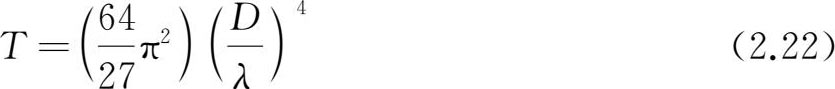 1998年,Ebbesen等在研究电磁波与亚波长银膜圆孔阵列相互作用时得到了异常的透射光谱 [9] ,如图2.5(b)所示。实验测试的圆孔阵列周期为900nm,圆孔直径为150nm,在稍大于周期尺寸的波长处,透射光谱中出现了明显的透过率峰。这些透过率峰的强度不仅大于圆孔相对于周期单元的归一化面积,甚至比Bethe等在1944年提出的经典小孔透射理论所求出的透过率高出若干个数量级。后者提出的经典小孔透射理论认为,光在透过无限薄金属板上的小孔时,其透过率可以由式(2.22)得到。