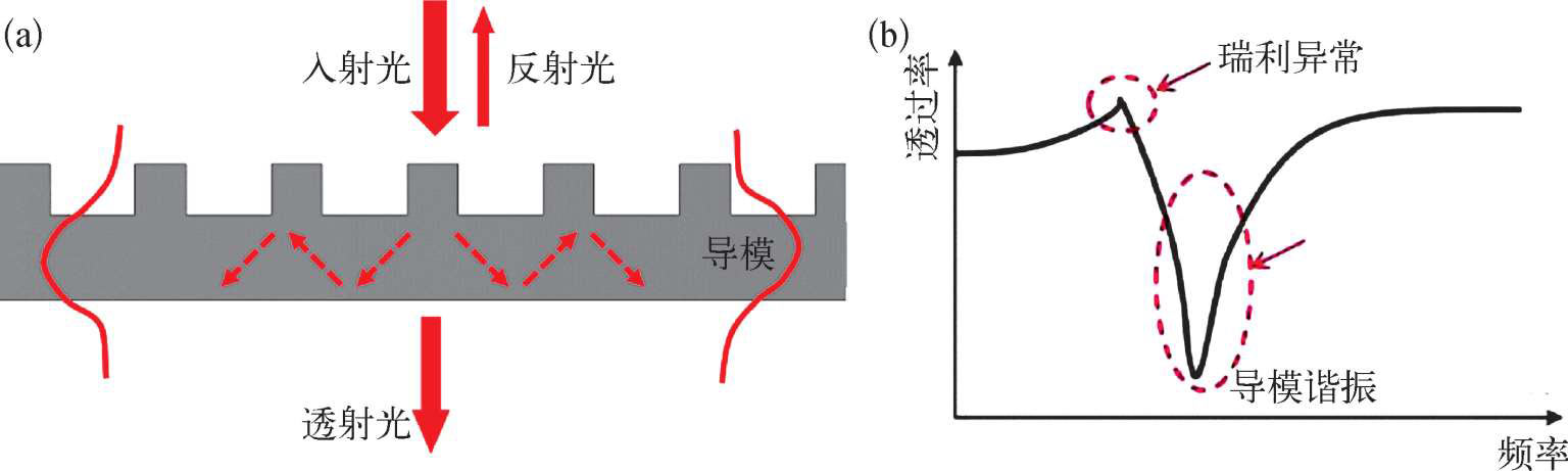 (a)亚波长介质光栅中的导模谐振;(b)传输谱线中的瑞利异常和导模谐振