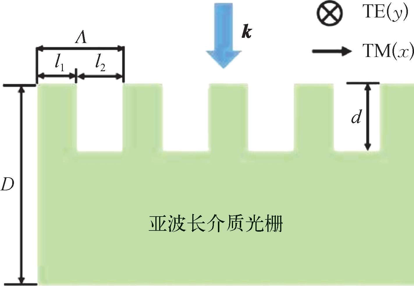 图2.10为亚波长介质光栅结构示意图。其主要由基底层和介质光栅层组成。基底层的折射率为