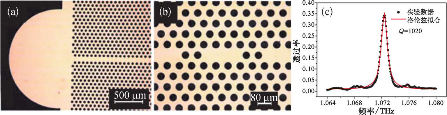 (a)THz光子晶体线缺陷;(b,c)光子晶体微腔及其谐振谱线 [5]