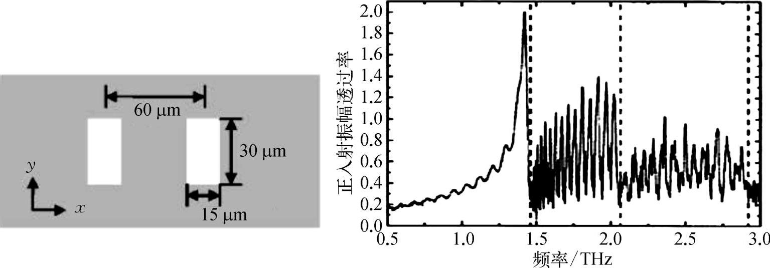 式中, k sp 是SP波波矢; k ∥ 为入射THz波波矢在平行于周期阵列表面的分量; q 为周期阵列提供的附加晶格矢量。若晶格周期为 d ,| q |=2π/ d 。图2.8所示为THz亚波长金属孔阵列结构及其振幅透射光谱线,它在1.46THz处发生强烈的传输增强效应,其正入射振幅透过率远大于1。