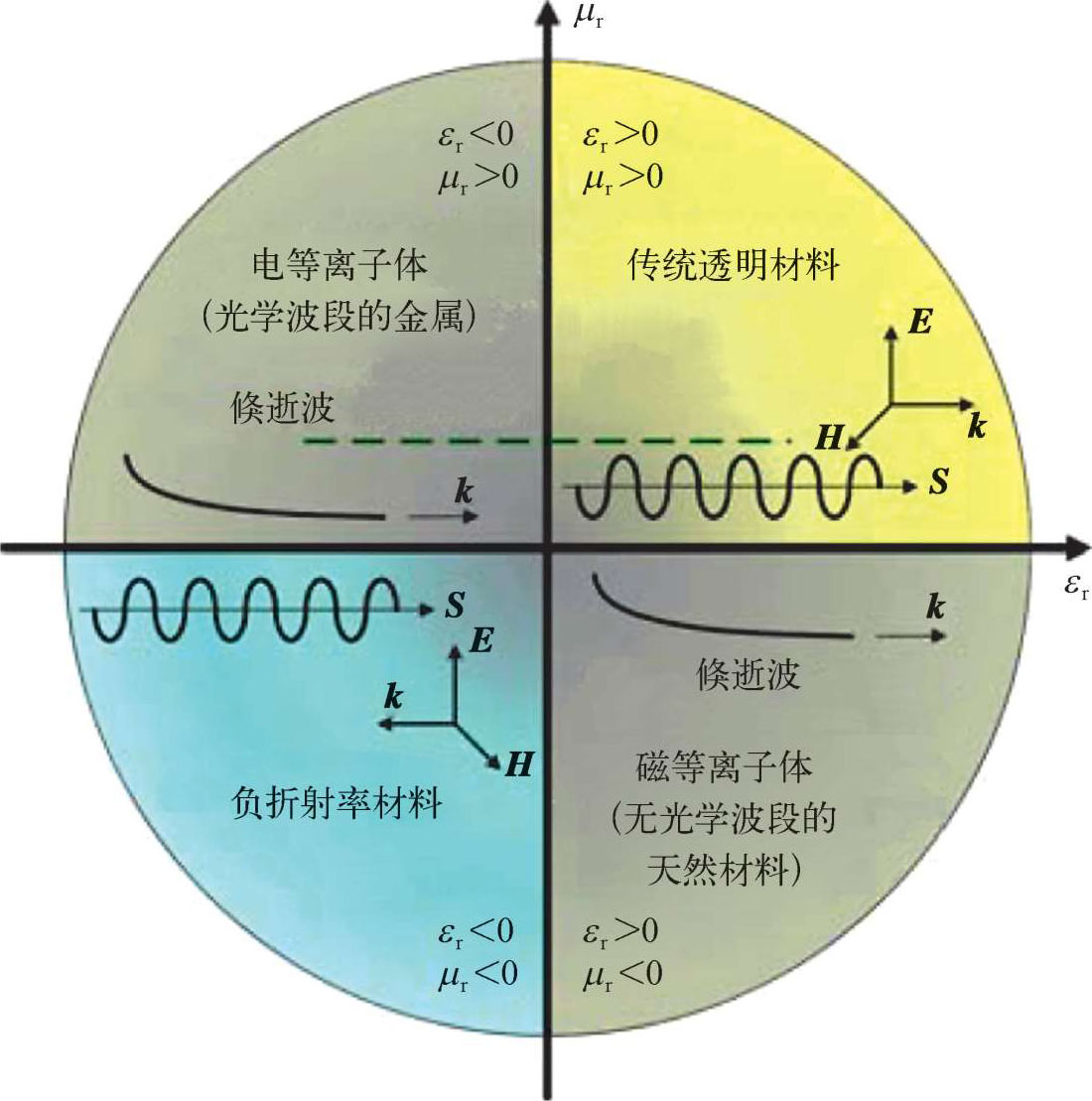 由于超材料对外场的响应主要取决于参数 ε 和 μ ,可以利用上述两个电磁参数的空间分布来实现材料分类。图2.12中介电常数实部 ε r 对应横坐标,磁导率实部 μ r 对应纵坐标。已知传统透明材料的 ε r 和 μ r 都为正数,所以其归属第一象限。当介电常数实部 ε r 为负数时,在材料内部引起的电(磁)场方向与入射场方向相反。贵金属材料在可见光波段就是典型的负介电常数材料,并且铁磁材料在谐振频率处具有负磁导率。当材料属于第二或第四象限时,两个参数之一为负数,导致其折射率为纯虚数,这种情况下,材料不支持光束传输。在光学领域,所有的传统材料都被限制在虚线 μ r = 1附近的一个极窄区域内,如图2.12所示。