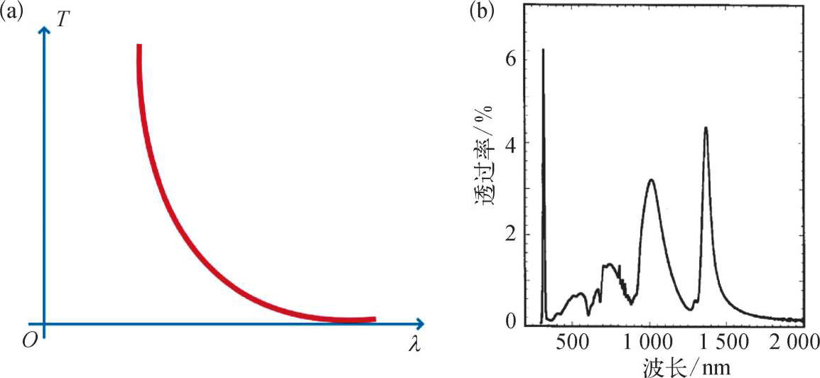 式中, T 为透射率; D 为小孔直径; λ 为电磁波波长。透过率与这两者比值的四次方成反比,如图2.5(a)所示。然而,图2.5(b)给出的透射光谱在一些特定的波长处出现了和理论预期不相符的结果,金属孔阵列似乎起到了增强电磁波透射的作用,这种现象被称为光学异常透射(Extraordinary Optical Transmission,EOT)。