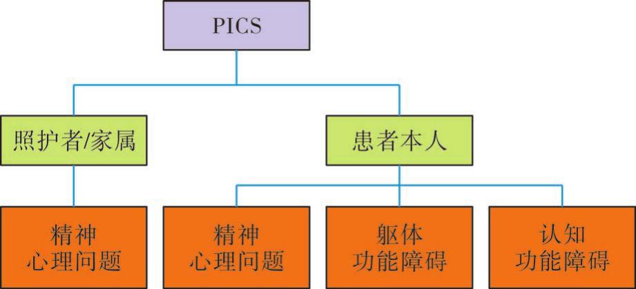 PICS主要包含了但不限于患者在危重病后所存在新发的或加重的躯体功能障碍、认知功能和/或精神(心理)功能障碍。PICS可能与ICU患者出院后多年的死亡率增加有关,然而目前还缺乏明确的证据表明引起PICS的最主要因素是什么。此外,更重要的是,该综合征并不是一种单一的疾病状态,它甚至不仅仅限于ICU患者,而在一定程度上与重症患者的照护者或家属相关(图5-3)。