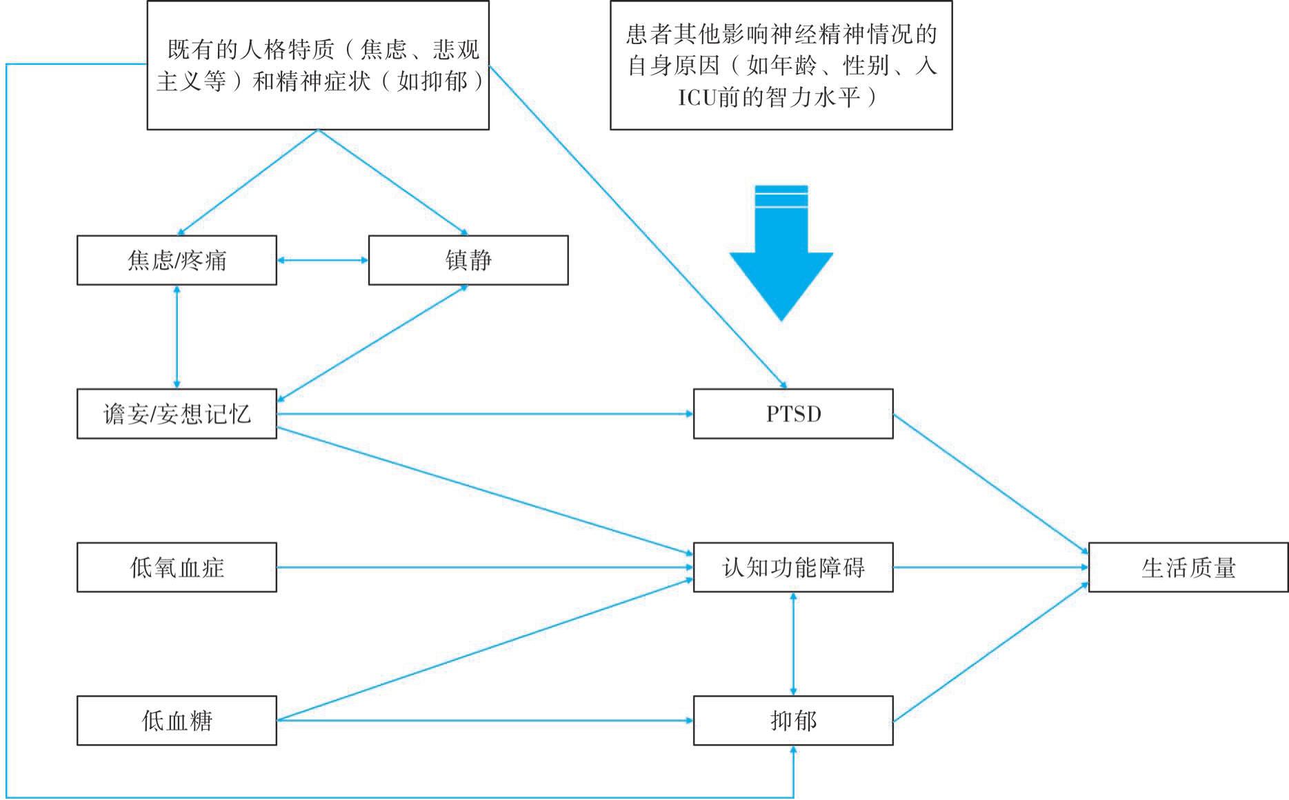 重症可能加速患者心理障碍的发展或加剧既往存在的心理障碍问题,从而对精神心理方面产生重大影响。重症患者的心理问题主要包括焦虑、抑郁及创伤后应激障碍。迄今为止,尽管研究人员已开始探索使用改变潜在危险因素(如谵妄和镇静等)的方法来预防ICU幸存者出现精神疾病,但这方面的关注度仍然比较低。图5-6显示的是影响ICU患者长期神经心理症状的危险因素。