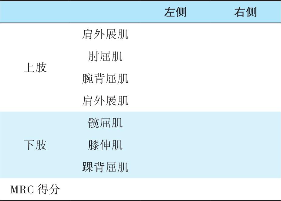 ICU获得性衰弱(ICU-acquired weakness,ICU-AW)是重症患者常见的并发症之一,表现为对称性四肢肌肉无力,反射通常减弱或消失,呼吸肌肌力受累,四肢疼痛反应减弱。ICU-AW会引起肢体功能障碍,延长机械通气时间,增加ICU停留时间和死亡率。使用医学研究会(medical research council,MRC)测试进行徒手肌力测量是目前最常用的诊断方法,每项0~5级评分,满分60分(双侧),MRC分数小于48分即可诊断为ICU-AW(表5-5)。如果MRC量表中肌力均≥3级,可再增加双手握力测试。但只有不到1/3的 ICU 患者处于清醒且非谵妄状态,能够遵嘱配合完成MRC肌力评估;60%的患者觉醒后仍无法完成肌力评估。