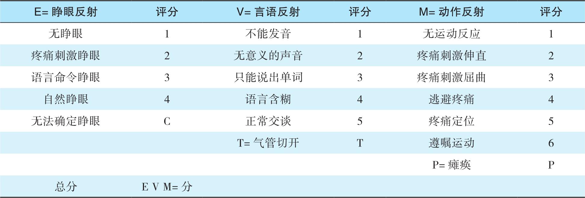 格拉斯哥昏迷量表(Glasgow coma scale,GCS)用于评估脑损伤患者的意识状态(表5-1)。通过睁眼反射(E)、言语反射(V)和动作反射(M)三个部分的评分,生成GCS总分。总分13~15分表示轻度损伤;总分为9~12分表示重度损伤;总分≤8分表示严重损伤,患者昏迷。最后确定总得分时,不对标注为C(无法确认睁眼)、T(气管切开)和P(瘫痪)的项目进行评分。