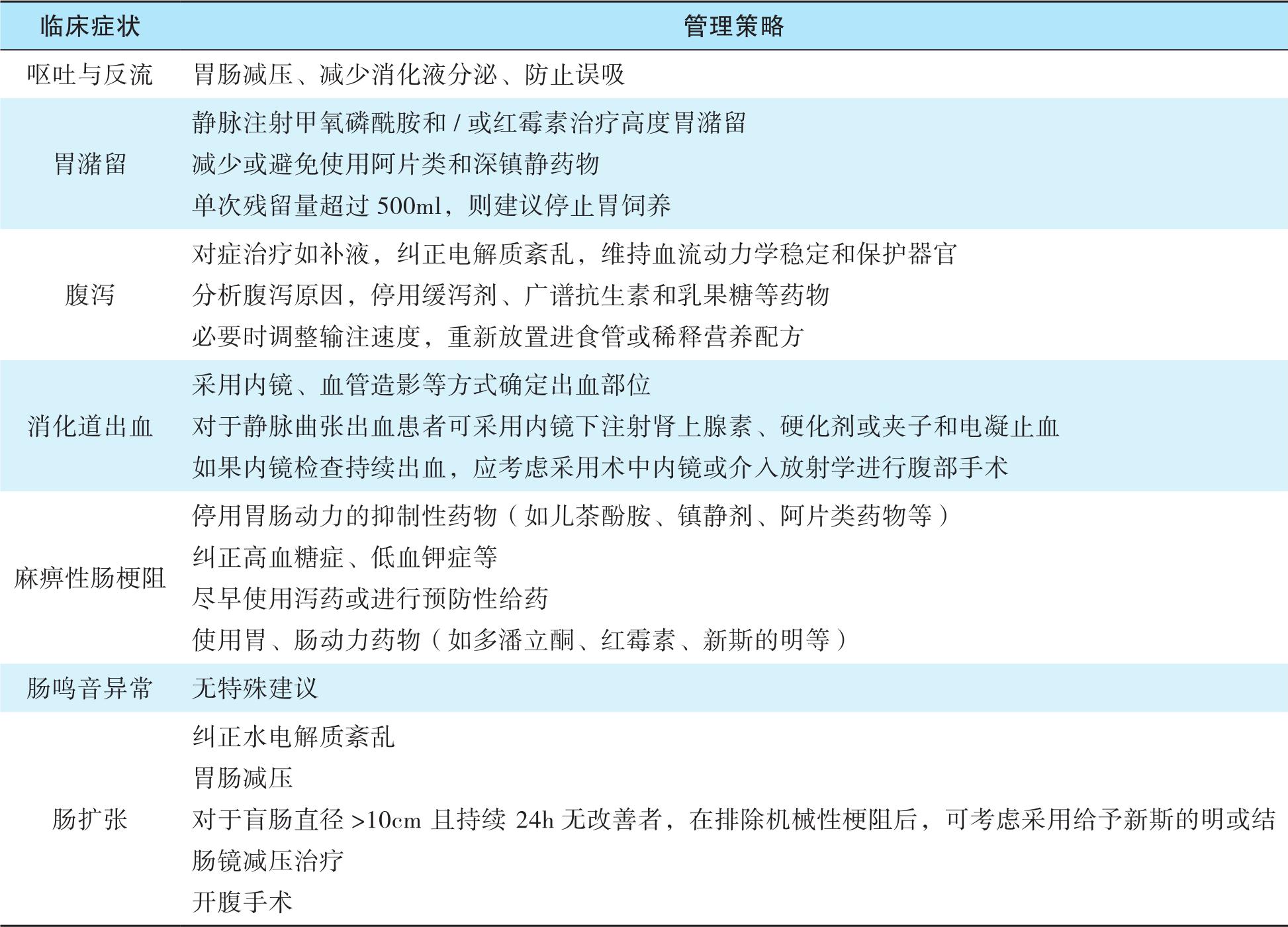 表5-7 ICU常见胃肠功能障碍及管理策略
