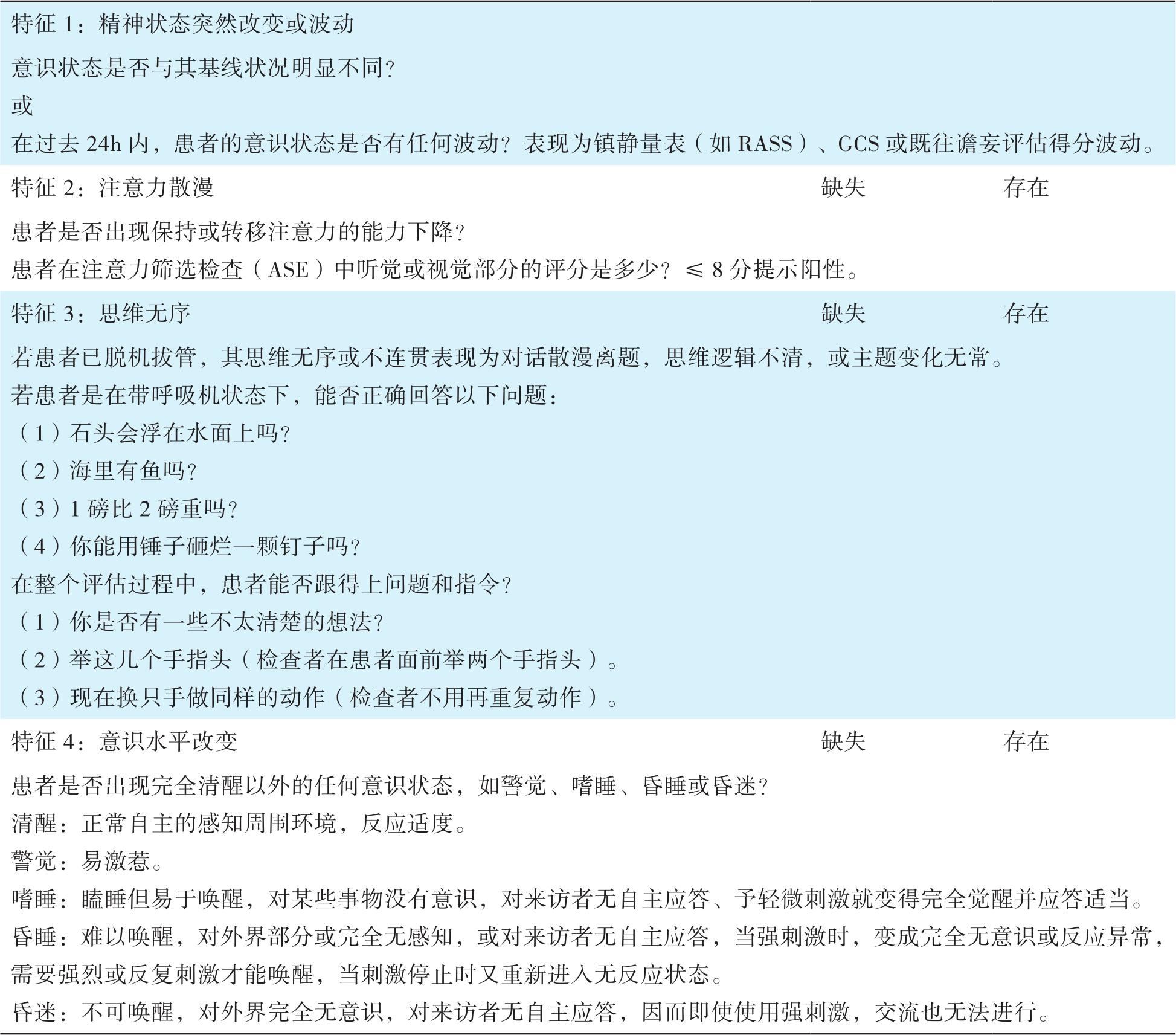 重症患者谵妄的评估通常使用ICU患者意识模糊评估表(confusion assessment method for the intensive care unit,CAM-ICU),包括:特征1精神状态突然改变或波动;特征2注意力散漫;特征3思维无序;特征4意识水平改变(警醒、嗜睡、昏睡、昏迷)。患者如果出现特征1加特征2,或特征3或特征4(二者之一),则CAM-ICU为阳性,可诊断为谵妄(表5-4)。