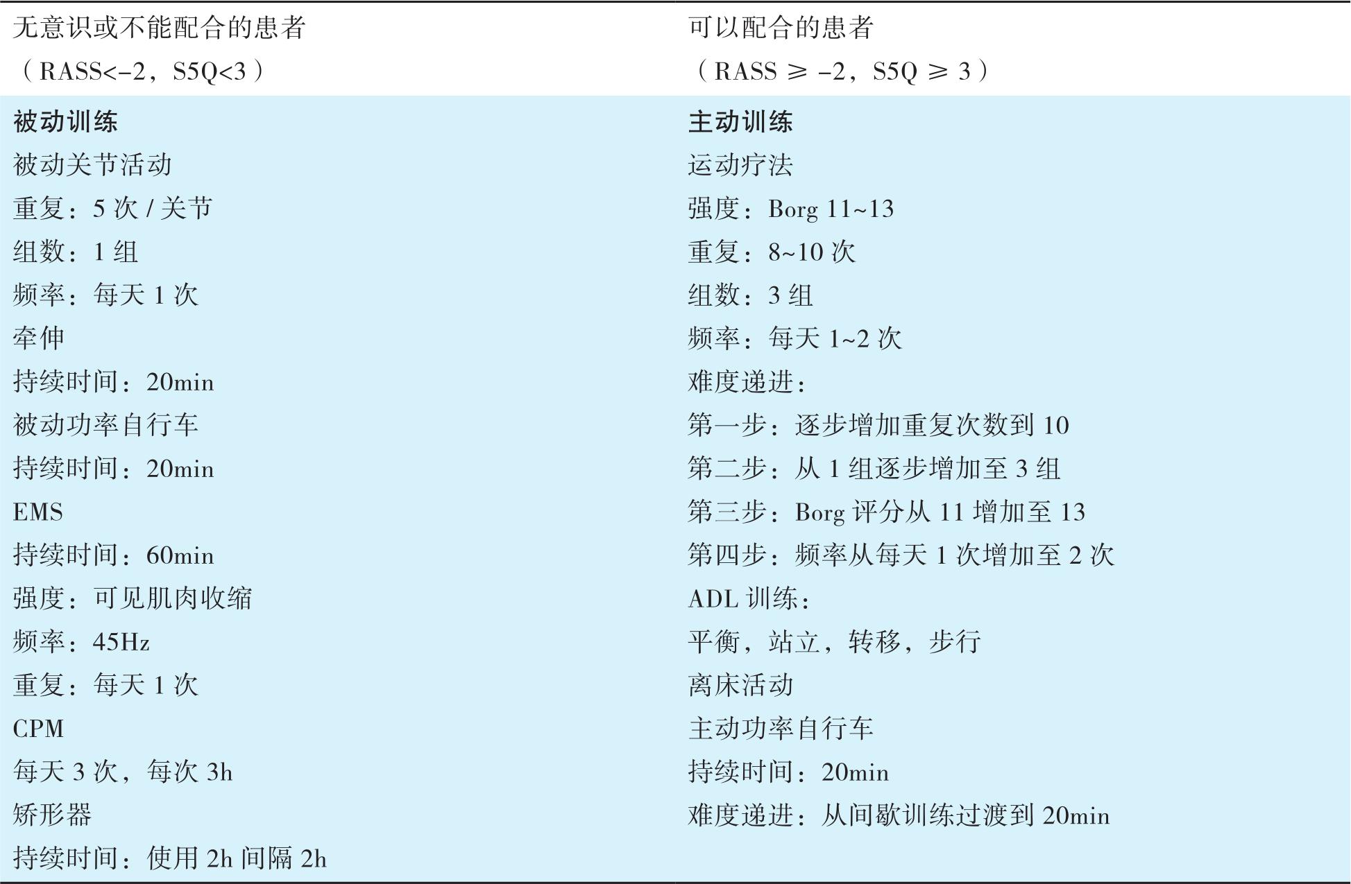 当患者处在急性期或不能配合时,应采取被动的方式训练如被动关节活动训练、肌肉牵拉、支具固定、体位摆放、被动自行车或神经肌肉电刺激等,同时还可以避免给患者的心肺功能增加额外的负担。而对于清醒的、病情稳定且能配合训练的患者(即使仍需要机械通气),则应进行早期的抗阻训练、主动功率自行车及早期活动如床上坐位、床边坐位、床椅转移、站立及步行训练等。对于ICU的早期活动及训练,多学科团队合作是必不可少的。在具体实施过程中应基于患者每天的评估制定相应的治疗计划。表5-6是一些ICU常用的评估方法与康复干预方法。