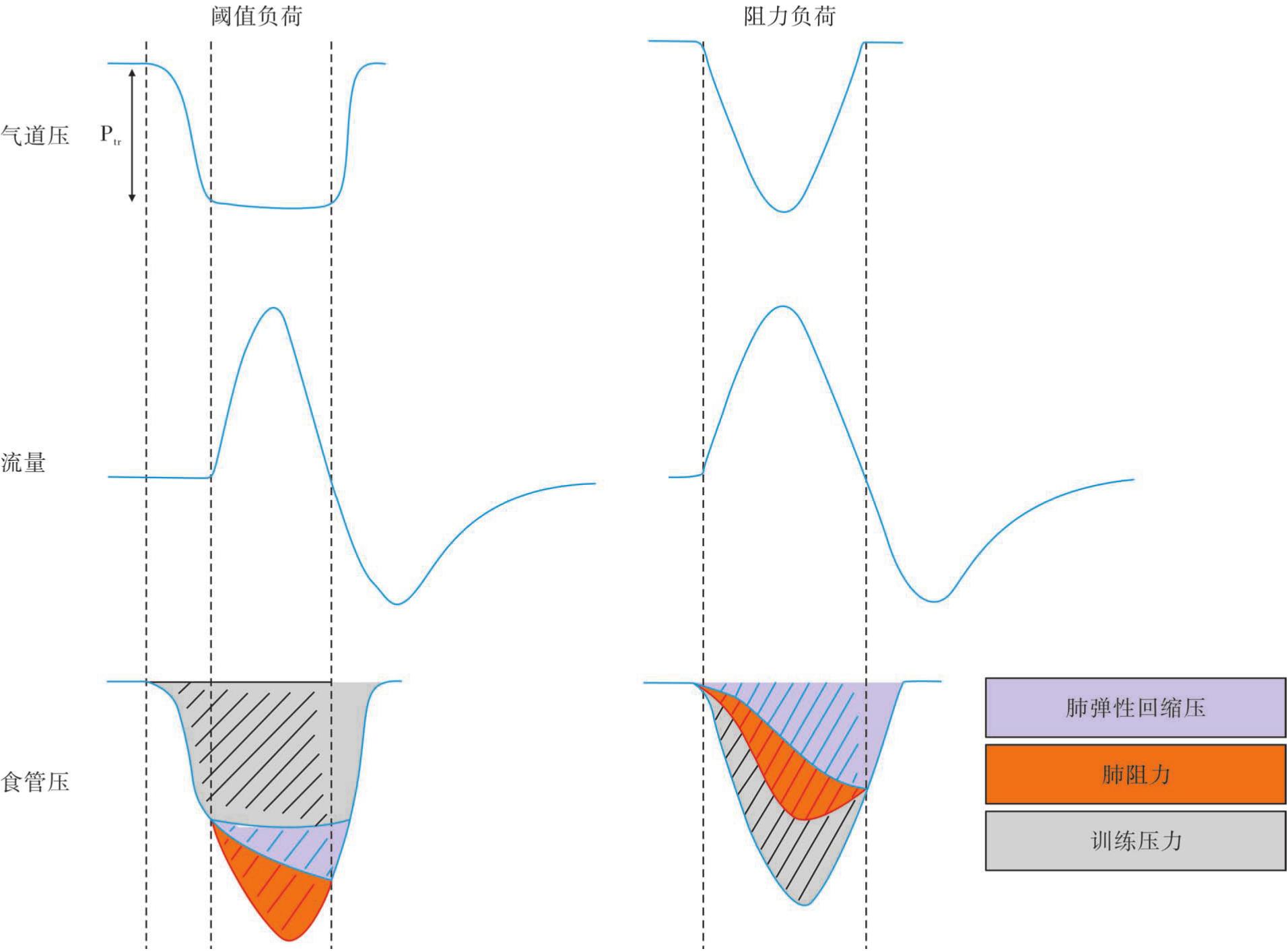 是通过在气道上使用阈值阀使患者的呼吸肌在吸气之前必须先产生一定程度的训练压力(Ptr)(类似于内源性呼气末正压的作用),在这个过程中,患者需要维持一定气流量所需的压力与患者或呼吸机产生的气流和容量无关。总的训练效果(图5-2左图黑色阴影区域)也与力学和呼吸驱动无关,并且更易于标准化。阈值负荷通常将患者最大吸气压的20%~50%作为训练强度在相对短的时间内(重复几次或几分钟)进行训练。