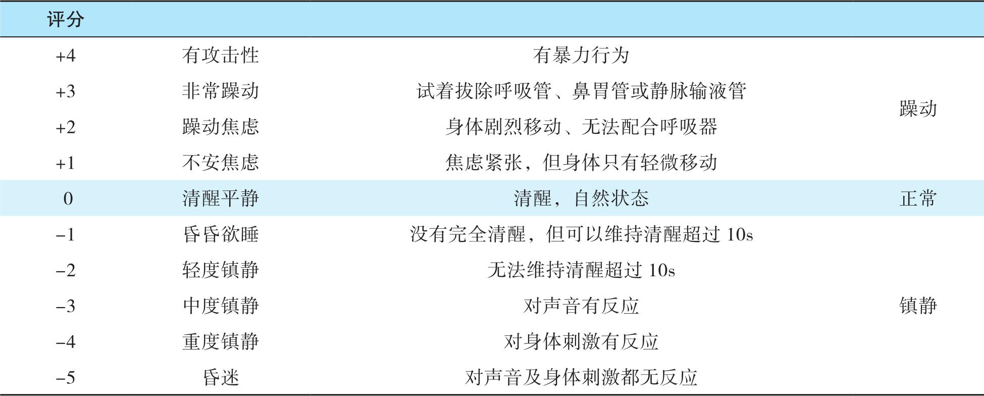 外科ICU中只有少数患者需要长时间深镇静,过长时间的深镇静给机体带来的伤害是多层面的,包括失去交流能力,呼吸抑制、膈肌功能障碍、肺炎风险增加、ICU获得性衰弱的风险增加、外周肌肉衰弱、延长机械通气时间/脱机延迟、心肌抑制和血流动力学不稳定、肠道梗阻、血栓性静脉炎和压力性损伤的风险增加、谵妄、延长ICU停留时间和住院时长、免疫抑制、造成永久性认知缺陷和慢性心理疾病、增加医疗费用等。Richmond镇静程度评估量表(Richmond agitation sedation scale,RASS)用于对重症患者的镇静状态进行评估(表5-3),若评分为-4或-5,则稍后应重新评估患者。2018年《预防和管理ICU成年患者疼痛、躁动/镇静、谵妄、缺乏活动和睡眠障碍临床实践指南》和《2018年中国成人ICU镇痛和镇静治疗指南》均强调镇静、镇痛应作为ICU治疗的重要组成部分,重视焦虑与躁动、谵妄、镇痛镇静并发症评估、治疗与监测,在病情允许的情况下尽可能地及时调整为浅镇静。以患者为中心的镇痛镇静方案(early comfort using analgesia,minimal sedatives and maximal humane care,eCASH),重点强调早期舒适化、镇痛为先、最小化镇静策略,实现最大的人文关怀。eCASH的核心环节是以人为本,体现人文关怀,具体的推荐实施方案包括重视并改善患者睡眠;早期活动策略;多模式合作;有效实现患者-医护人员/家属的交流;医护人员、患者、家庭共同参与治疗目标的构建。ICU患者的镇痛镇静并发症与谵妄的发生紧密相关。