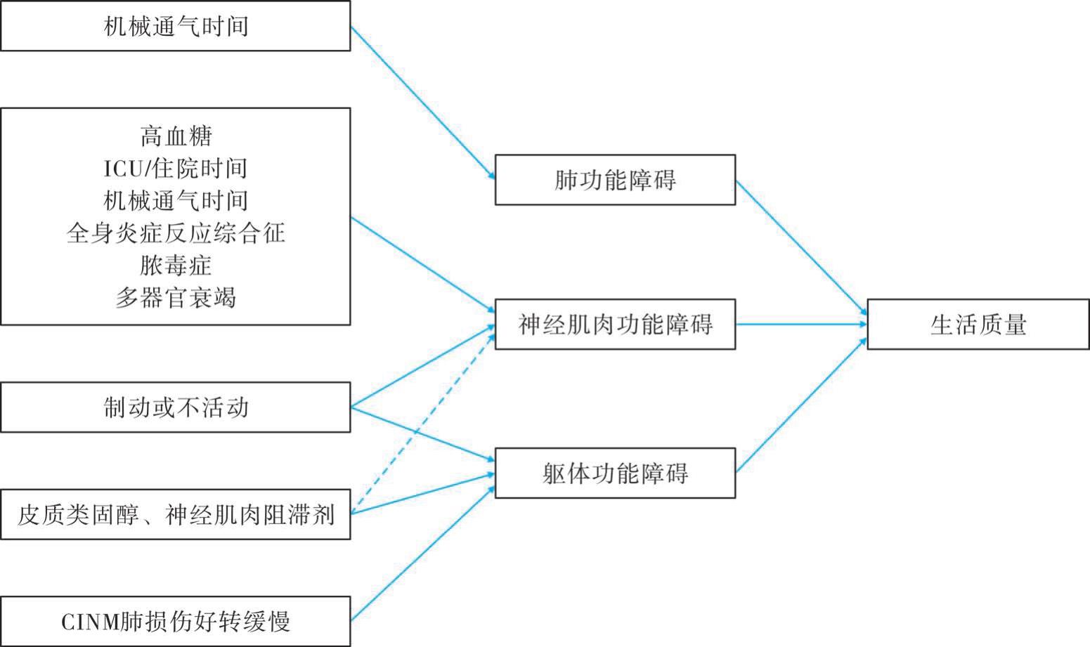 重症患者在ICU停留期间,由于长期卧床及活动受限会导致身体出现严重的去适应作用,并严重影响患者的呼吸系统、肌肉骨骼系统、神经系统、肾脏及内分泌系统等的功能。患者在ICU住院期间还面临着许多其他危险因素,如长时间的机械通气、全身性炎症,以及皮质类固醇等药物的使用都将直接或间接地影响患者出院后的躯体功能和长期生活质量。图5-4显示的是ICU内对患者长期躯体功能障碍影响的险因素。