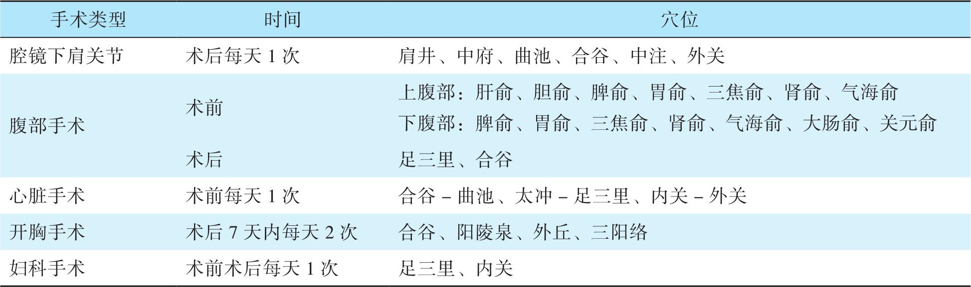 (7)中医药主要采用针灸和中药对围术期患者进行镇痛,减少阿片类药物的使用。目前尚缺乏高质量的临床研究,因此中医药方法还是以针灸为主,推荐方法见表6-5。需要注意的是,此方法应由有资质的针灸医生进行。