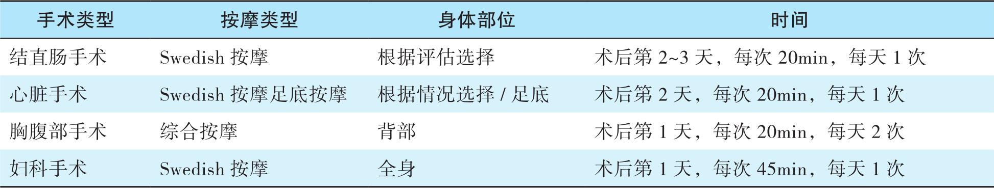 (6)按摩可缓解术后疼痛与焦虑,属于多模式镇痛中非药物疗法的一种,不同手术对应的不同部位按摩详见表6-4。