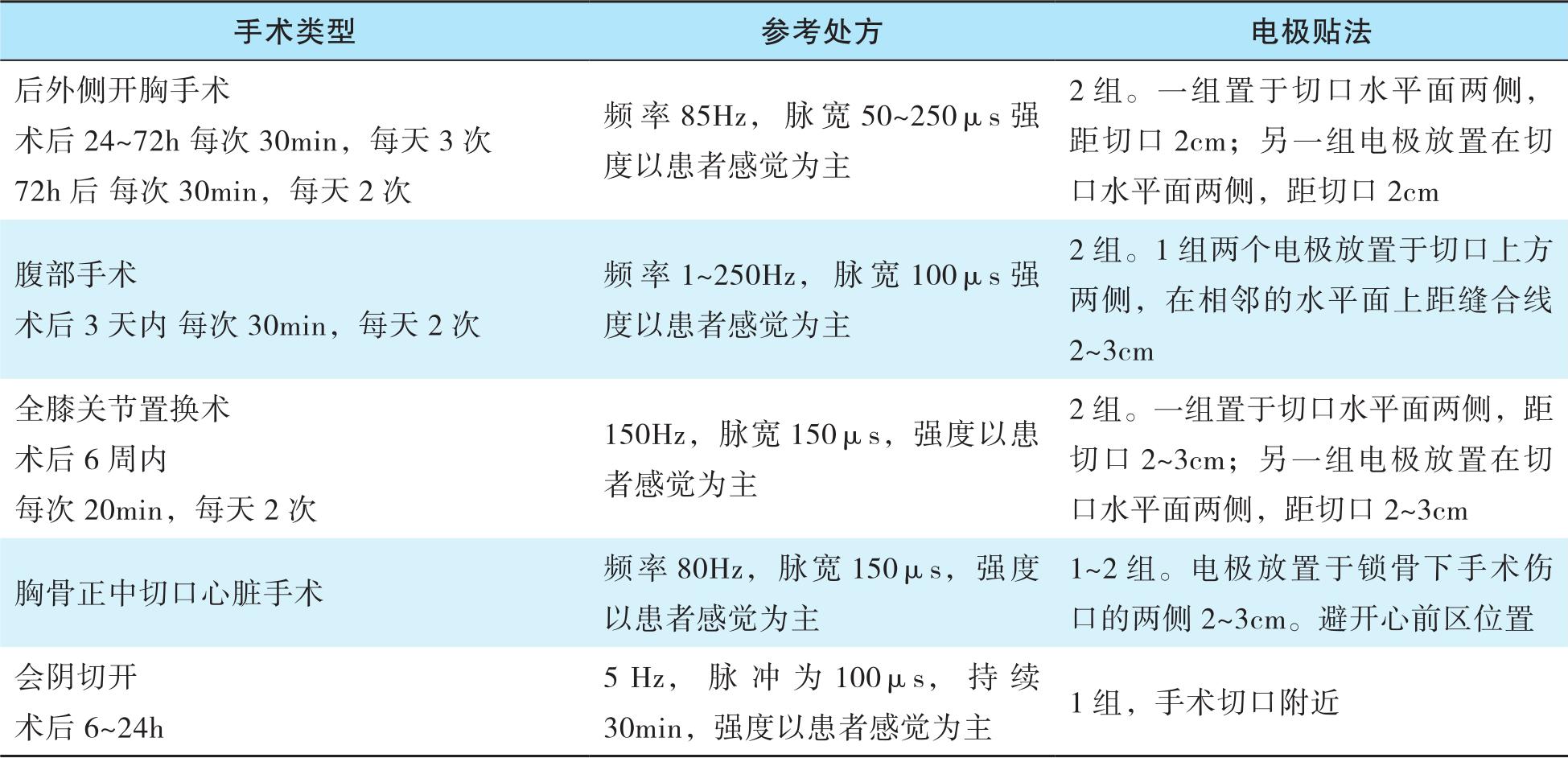 (1)经皮神经电刺激(transcutaneous electrical nerve stimulation,TENS)通过刺激直径大的传入神经纤维,激活内源性下行抑制通路,激活阿片受体,从而降低中枢兴奋性,减轻疼痛。不同患者的手术和切口都有所差异,常见手术的TEMS治疗处方见表6-3。注意,睡觉时不建议使用,若有皮肤过敏、皮肤破损请停用。