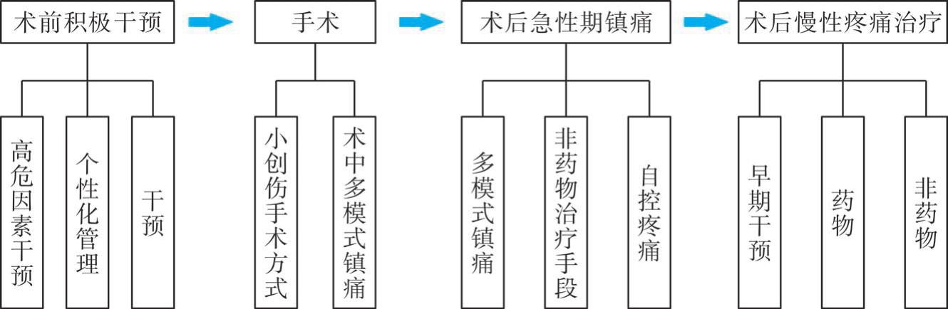 围术期疼痛管理指南建议术后慢性疼痛的管理应从术前开始进行,具体流程见图6-10。术前筛查高危因素积极干预,术中根据实际情况选择创伤小的手术方式,术后急性期采用多模式镇痛以及术后早发现早治疗慢性疼痛。慢性疼痛的治疗可根据患者具体评估结果选择合适的方法,如理疗、水疗、运动疗法、认知行为疗法、心理治疗等。