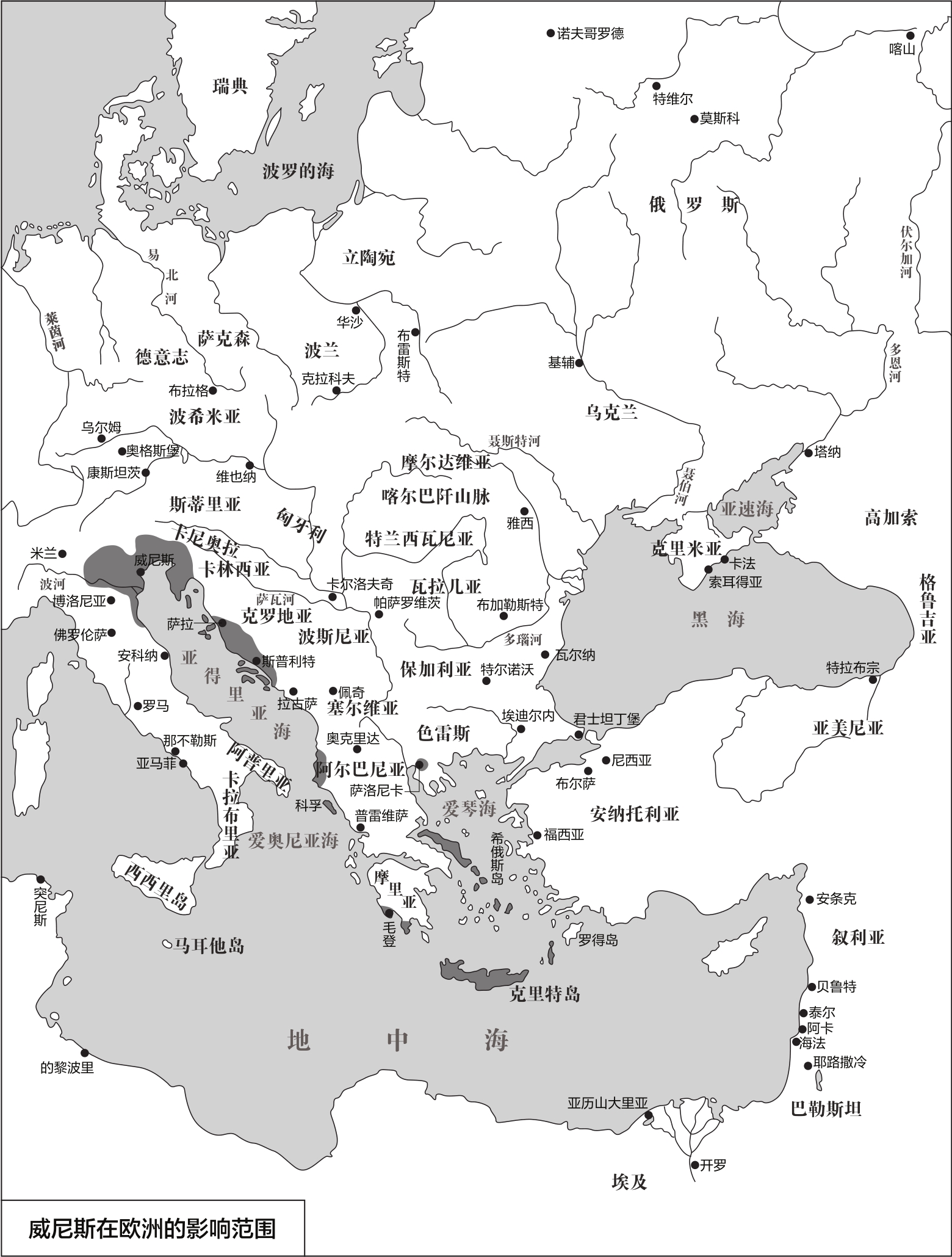 在书中,麦克尼尔也从文化同化与排斥模式来观察1282—1481年期间明显受到威尼斯文化影响的欧洲区域。此时,欧洲有三种文化彼此竞争:哥特式、拜占庭式及蒙古—突厥式复合文化。到了1481—1669年期间,威尼斯的情势则开始走下坡。此一时期,欧陆势力版图变动,威尼斯不再是奥斯曼帝国的对手。然而,最终重创威尼斯的因素,主要还是商船技术的落后、资源及食物短缺、行政体系的僵化、瘟疫的侵袭、舰队失去优势等。