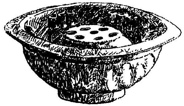 该时期插花形式多样,插花容器精美(古董器具或名窑瓷器等),技艺精湛,意境深邃,赏花境界颇高。强调花材姿韵皆佳,品格高尚,多选用寓意深刻的松、柏、竹、梅、兰、桂花、山茶、水仙等上品花木;造型构图追求线条优美,突出“清”“疏”风格,追求花材的寓意,讲求格高韵胜,寓教于花,以花传情,出现了“理念花”。插花容器也有很大的发展,在五代占景盘的基础上,出现了三十一孔瓷花盆(图1.5)、十九孔花插、六孔花瓶等。说明当时插花构图对花材插置的位置已经十分考究。插花容器以古铜器和上好的瓷器为佳,并配以几架、附座或承盘,使插花作品更显高雅。