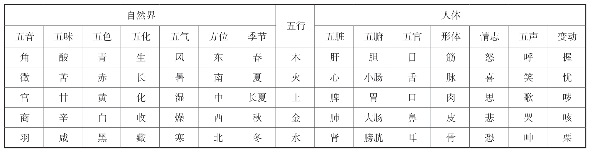 (2)事物与现象的五行归类:五行学说依据五行各自的特性,对自然界的各种事物和现象进行归类,从而构建了五行系统。