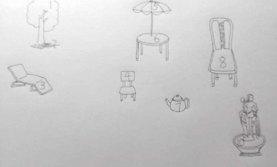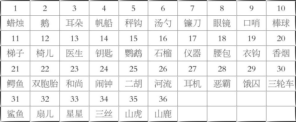 第一步,找数字桩:1~7的数字编码分别是蜡烛、鹅、耳朵、帆船、称钩、勺子、镰刀共7个